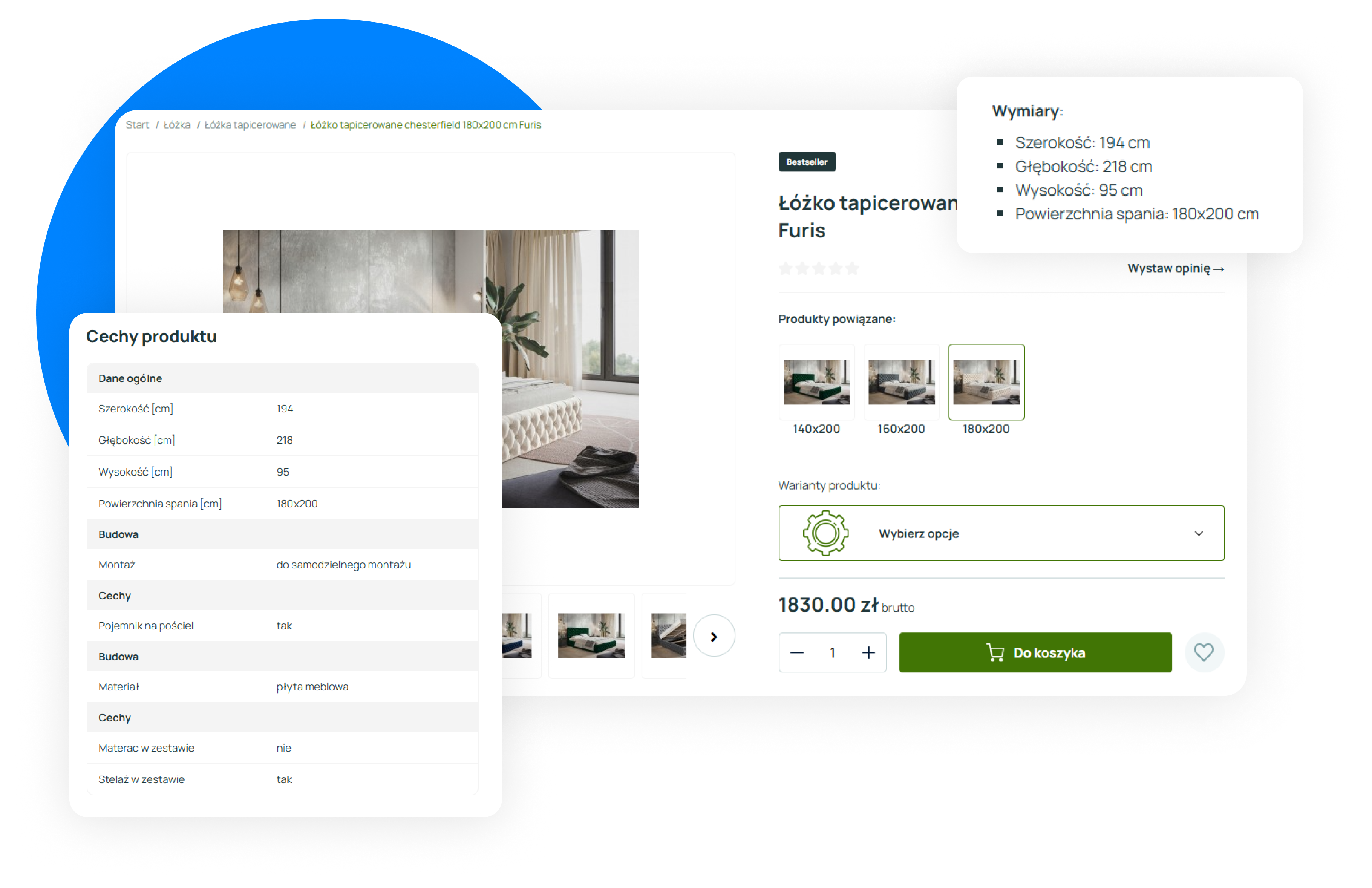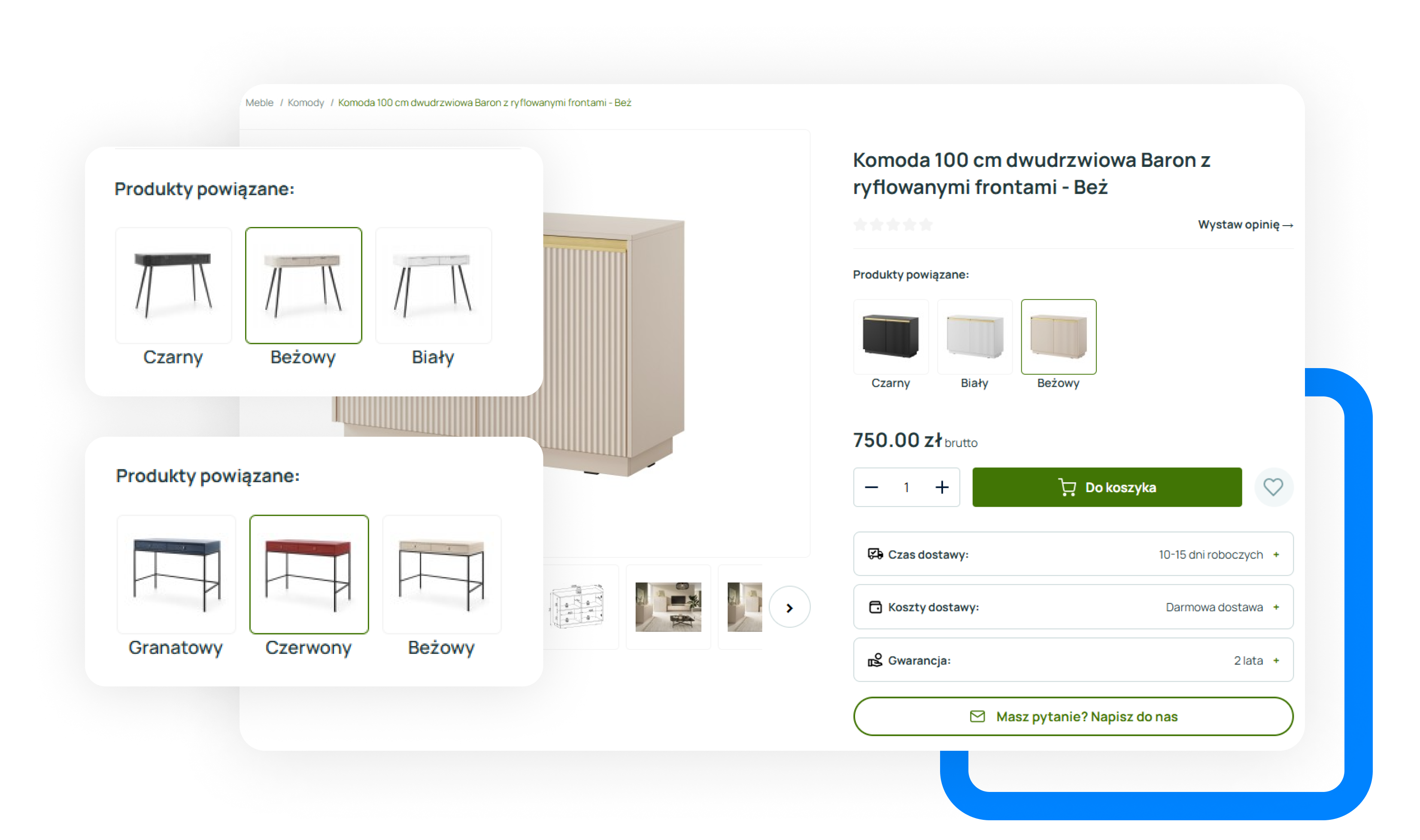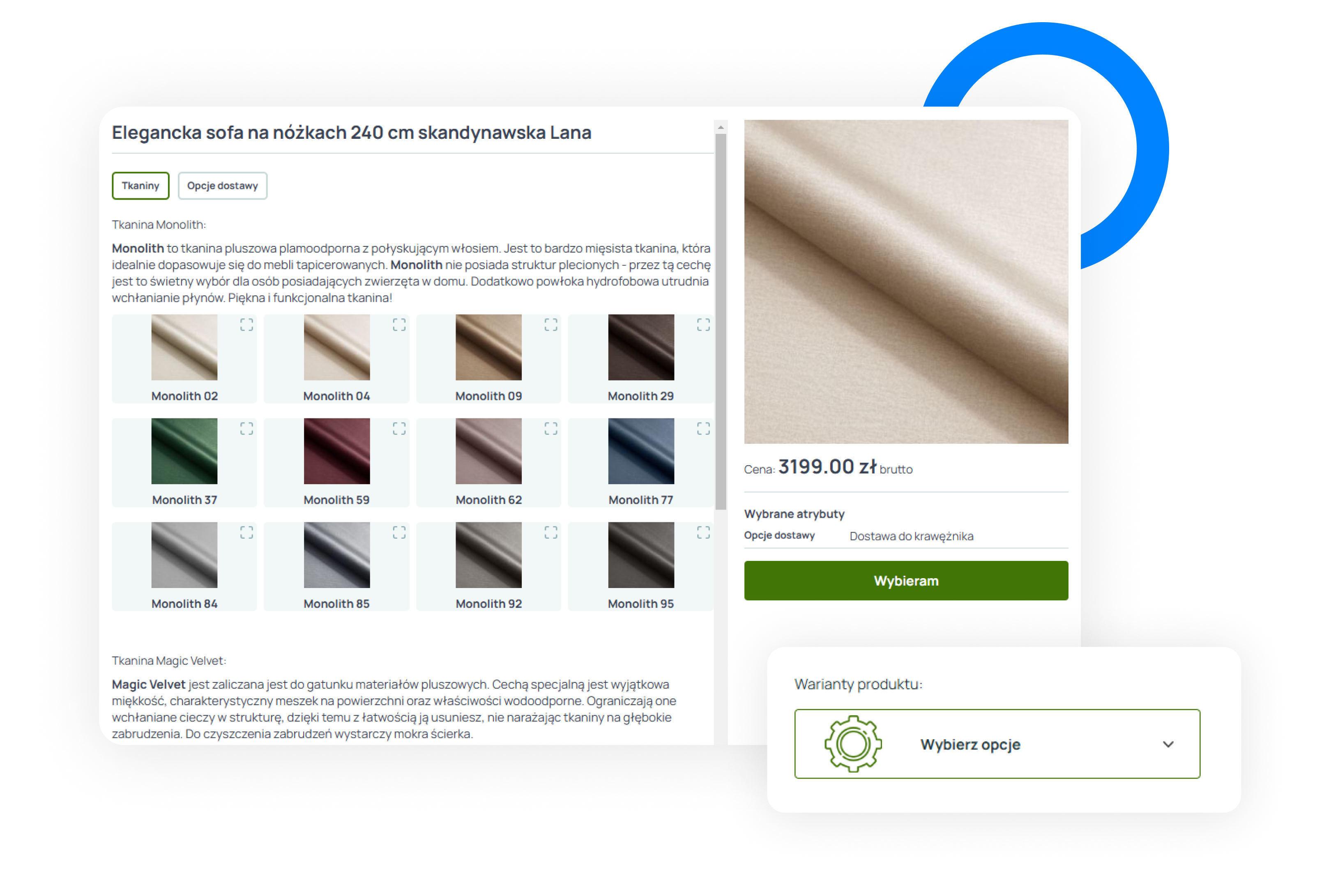 You can place a configurator on any product page, where the customer can select additional options – for example, the color and type of fabric and other details regarding furniture personalization.