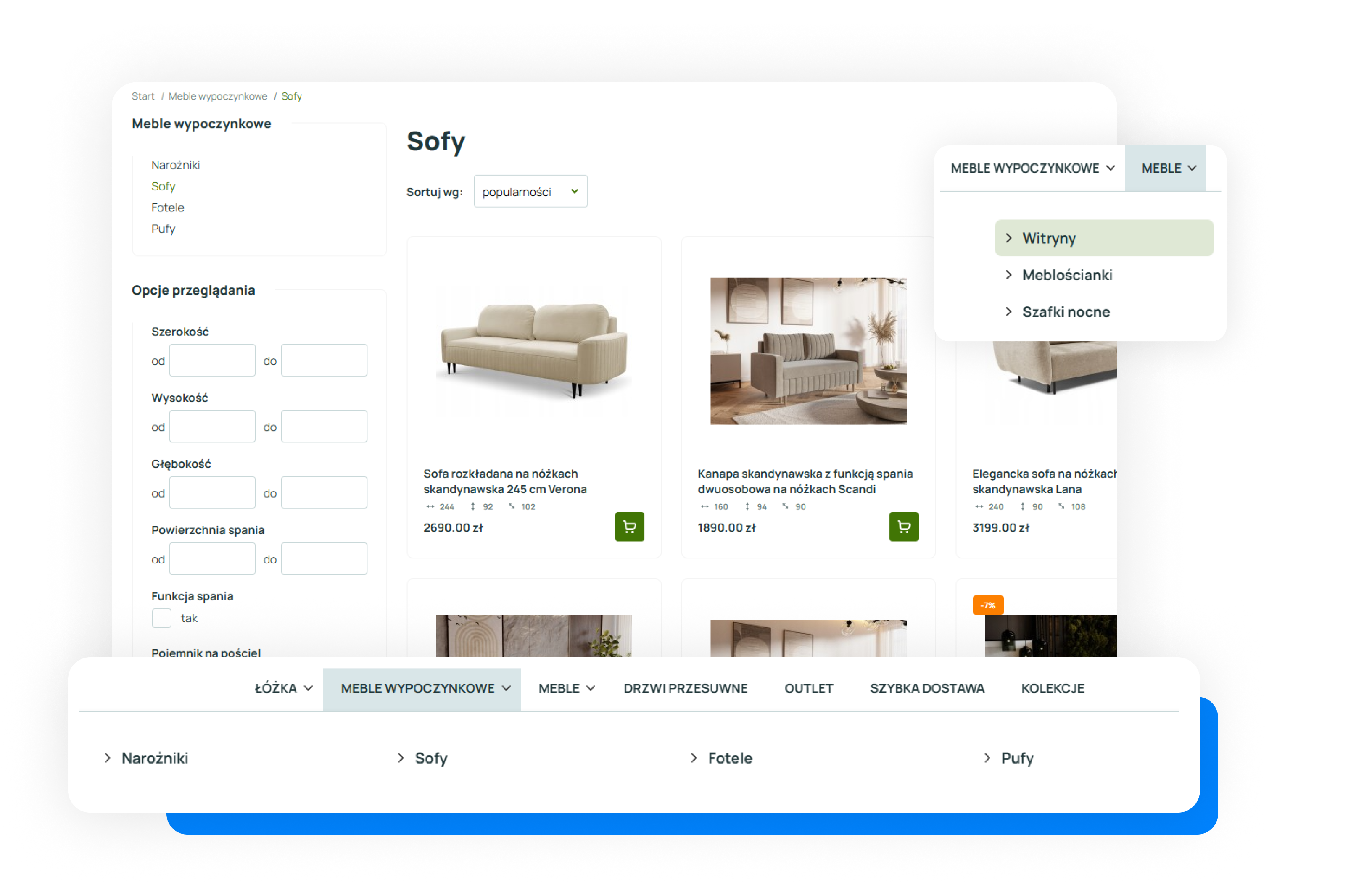 Do you manage a furniture store and are looking for a tool that will allow you to stand out from the competition? VerseoShop platform is the perfect solution for you! Create a unique online store that attracts customers and increases your profits. Enjoy all the functions offered by VerseoShop in the selected Starter Store or Professional Store option, and additionally take advantage of dedicated solutions prepared especially for furniture stores